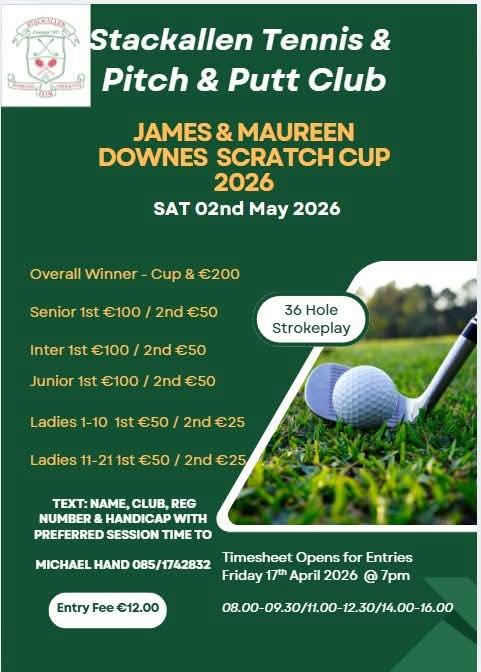 James & Maureen Downes Scratch Cup 2026 – Time Sheet Opens this evening at 7pm – Entries to Michael 17/04/26 | Uncategorized James & Maureen Downes Scratch Cup 2026 – Time Sheet Opens this evening at 7pm – Entries to Michael Hand Only on 0851742832 Source