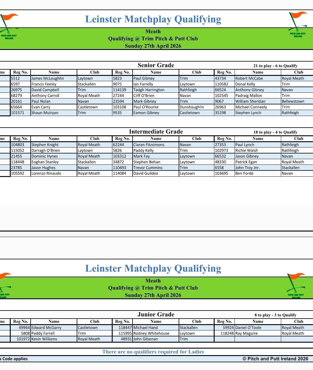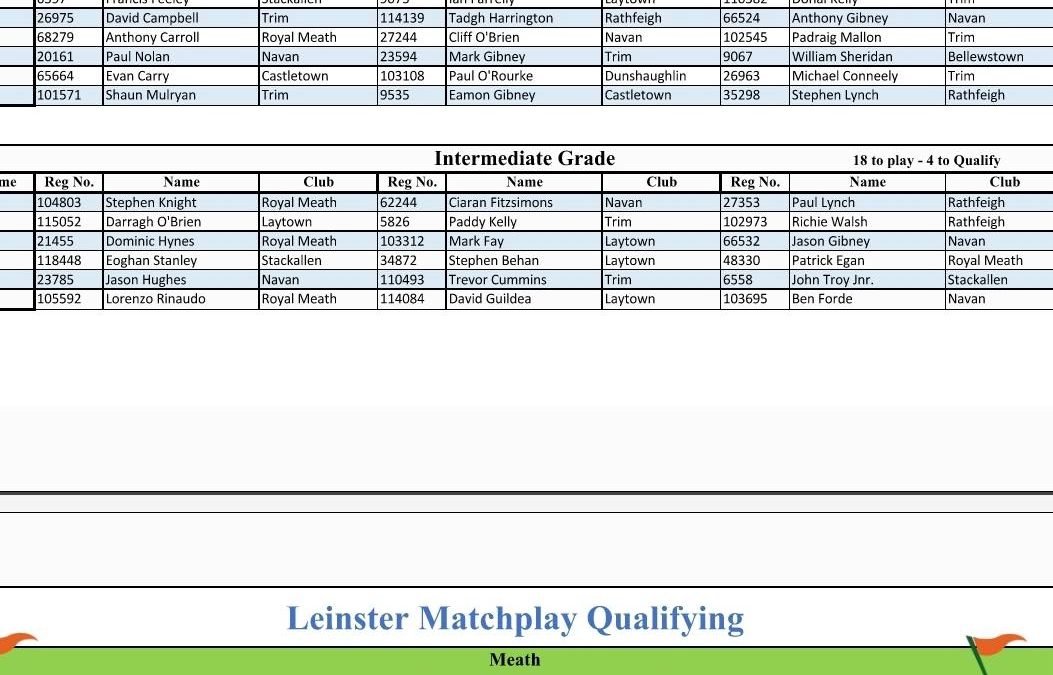 - Leinster Matchplay qualifier in Trim on 27th of April. Times be released at a later date