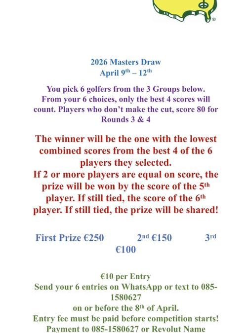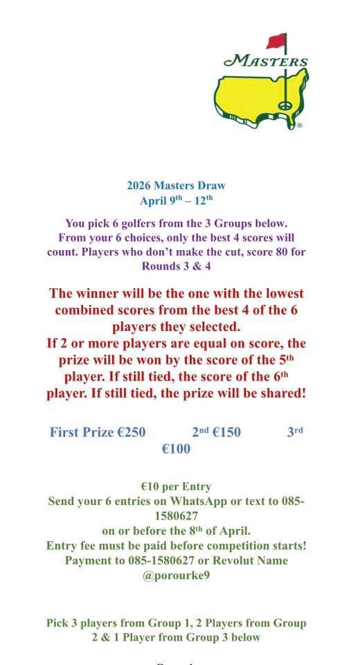 Meath county board are running a Masters draw. Anyone looking to enter can contact Paul O’Rourke, details below