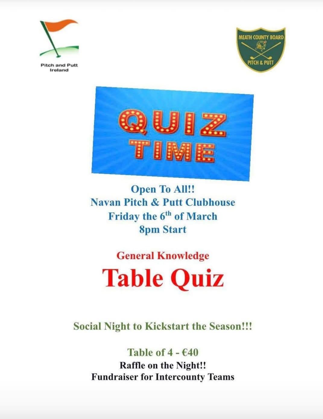 • Quiz night Friday 6th of March 8pm in Navan p&p club house. Test your general knowledge it’s going t